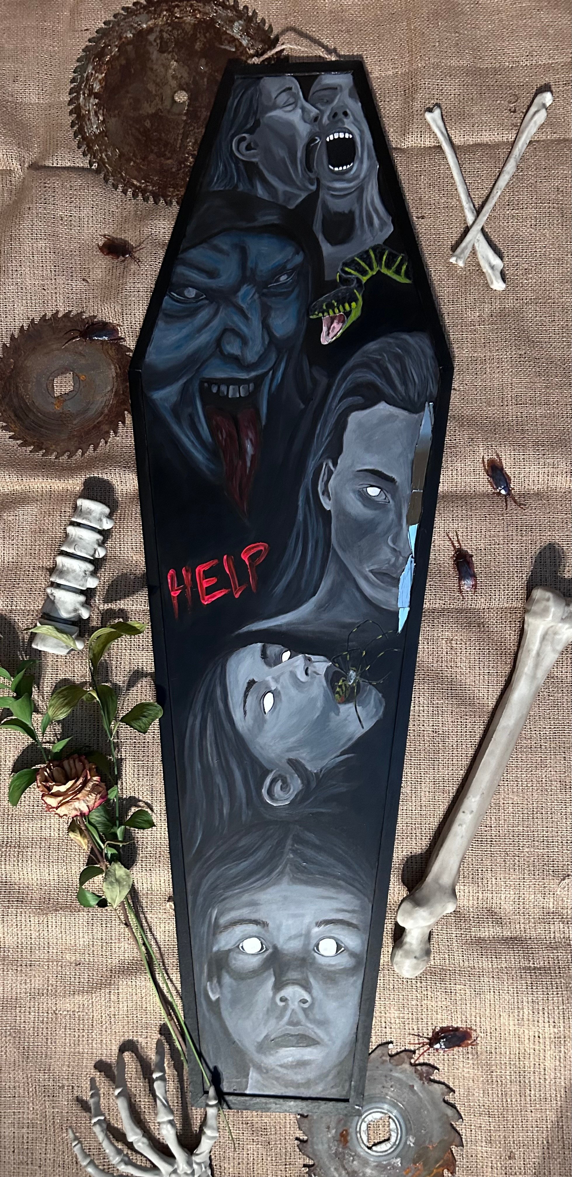 Trapped somewhere between terror and stillness, “Silent Screams” is a descent into the unspeakable. This one-of-a-kind hand-painted wooden coffin features a haunting vertical procession of pale, hollow-eyed faces — each figure frozen mid-scream, mid-suffering, mid-something far worse.