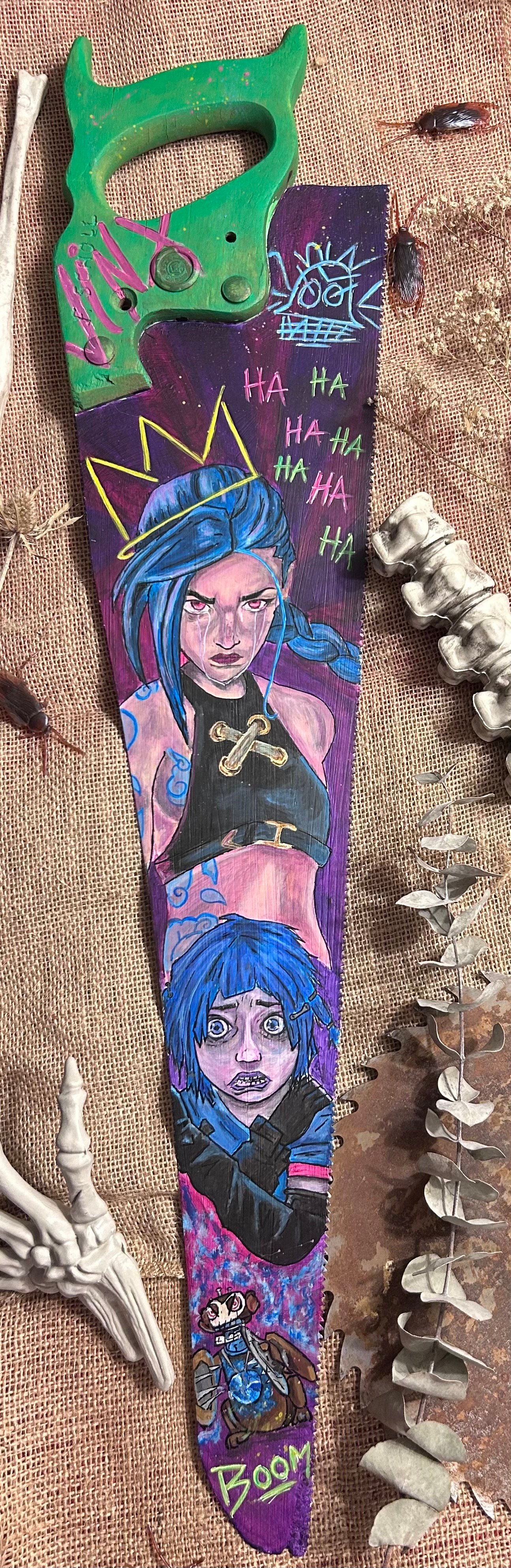 Unhinged, electric, and undeniably iconic—this 26” reclaimed handsaw features an explosive portrait of Jinx from Arcane and League of Legends. Bursting with vibrant color, layered graffiti, and that signature chaotic charm, this piece captures Jinx in all her manic glory—complete with wild eyes, war paint, and a cheeky “BOOM” from her favorite explosive friend.