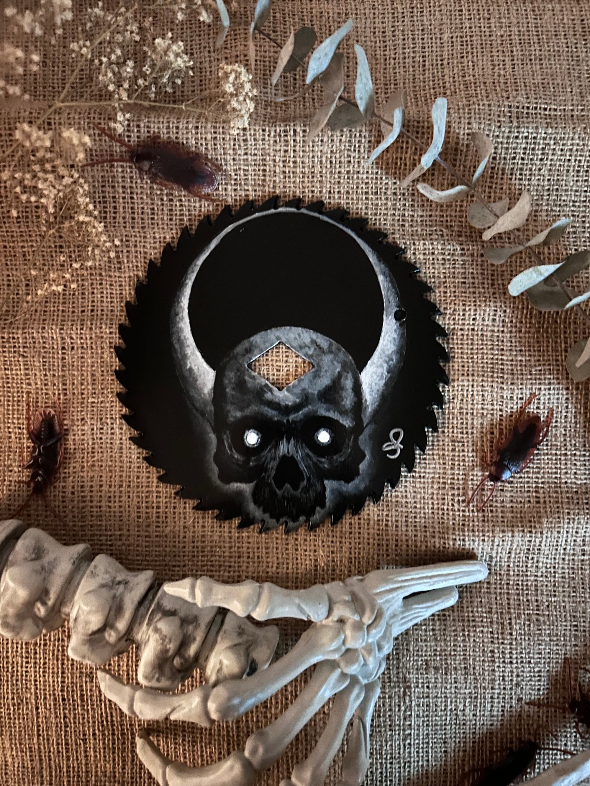 Painted on a recycled 6” circular saw blade, this one-of-a-kind piece blends lunar symbolism with death itself. A ghostly skull stares from the shadows, framed by a crescent moon, painted in layered acrylics with textured, haunting detail.